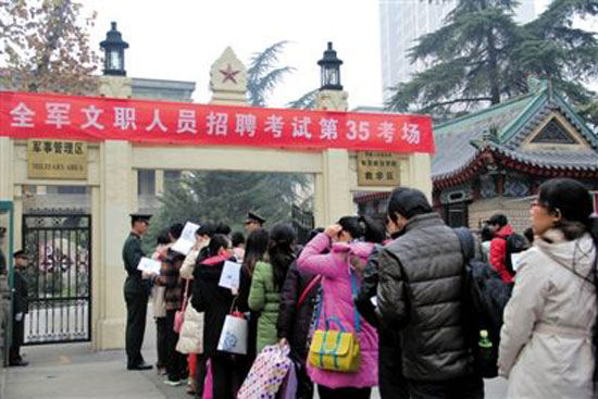 12月15日,在解放軍南京政治學(xué)院考點(diǎn),考生等候進(jìn)場參加考試。當(dāng)日,軍隊(duì)首次統(tǒng)一招聘文職人員考試舉行,據(jù)解放軍總政治部有關(guān)部門介紹,共有10萬余人報名應(yīng)聘,報名和錄取比例平均為38∶1。